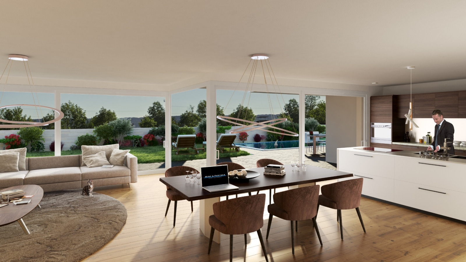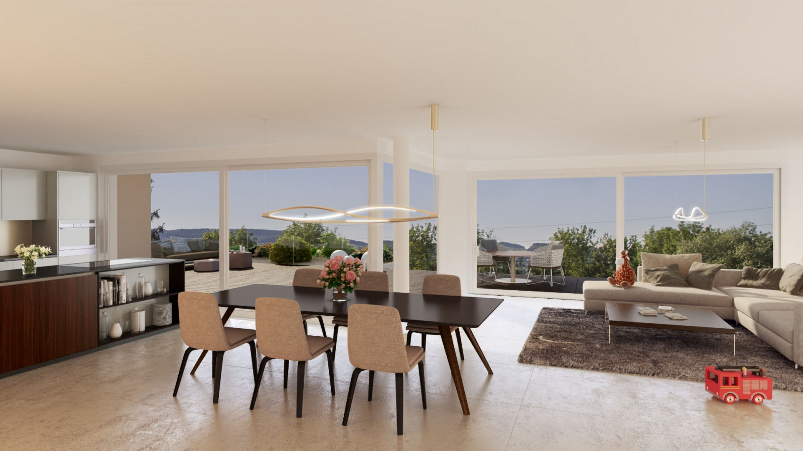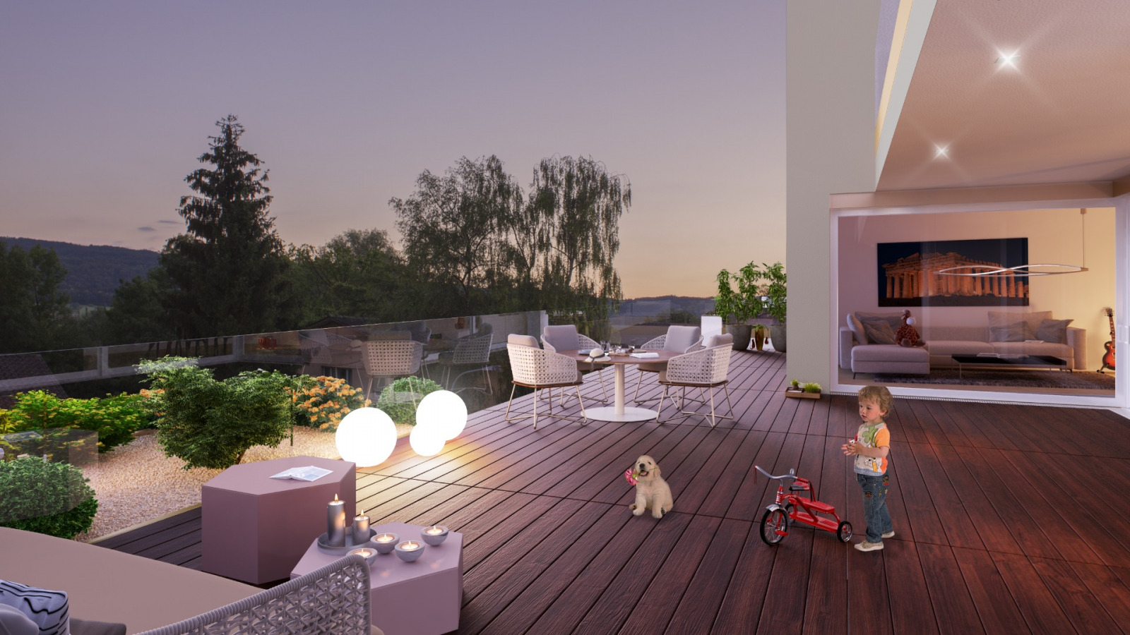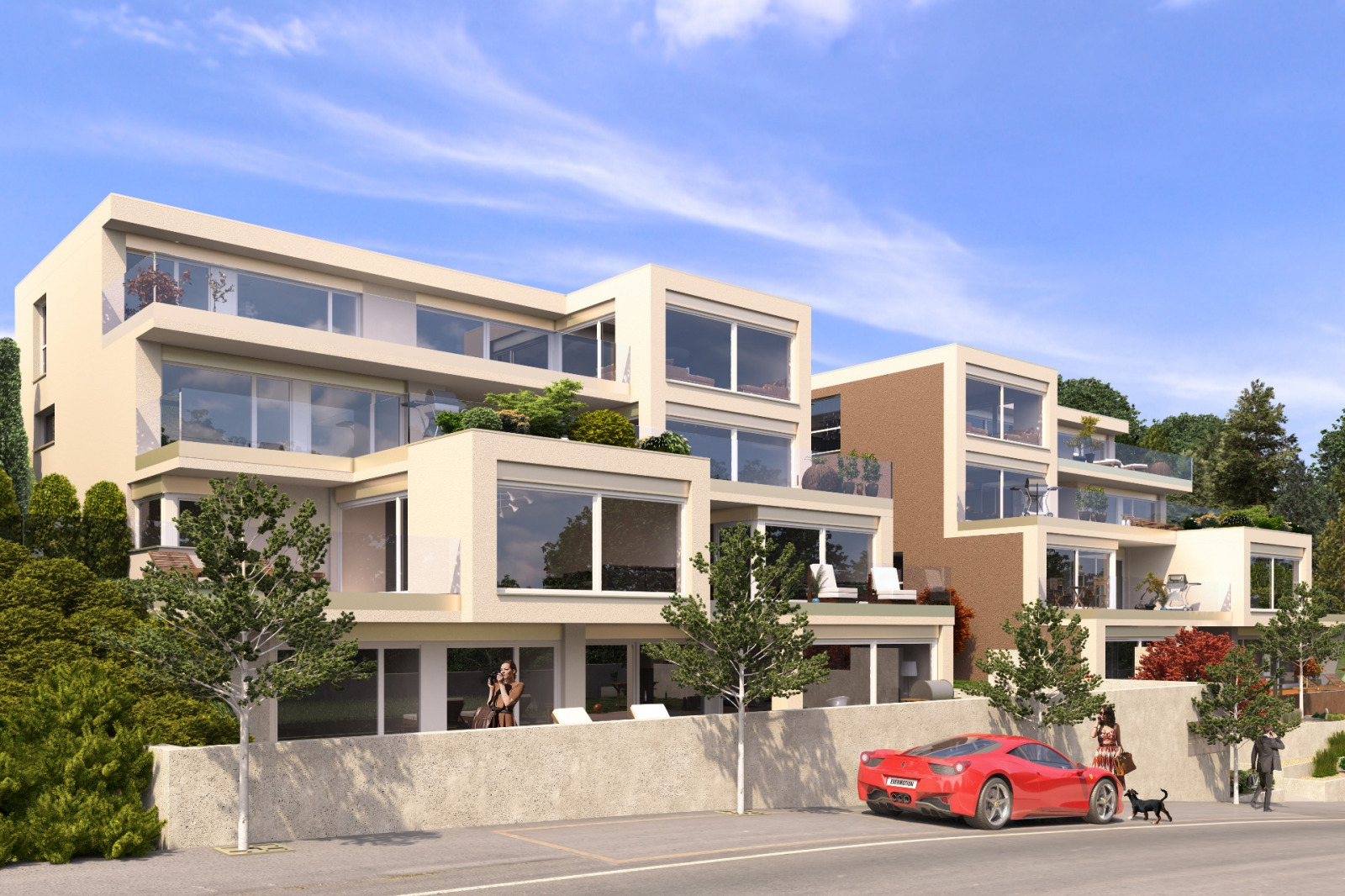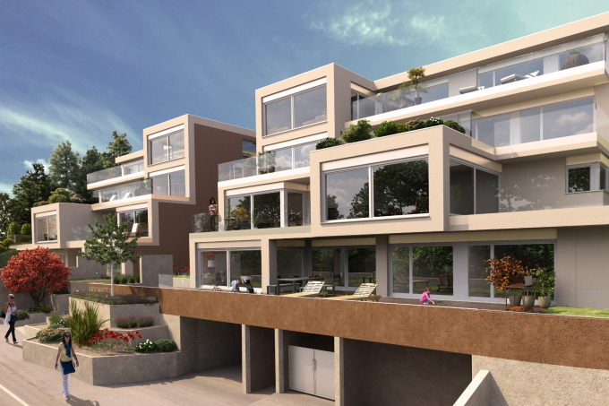 Sie sind alle nach Südwesten ausgerichtet und verfügen über einen grosszügen privaten Garten oder eine Terrasse. Zwischen den beiden Trakten der Anlage öffnet sich ein schmaler Innenhof, den wir als hängenden Garten ausgestalten. Auf der höher gelegenen Rückseite der Gebäudeanlage entsteht ein gemeinschaftlicher Garten- und Spielplatz. Eine Tiefgarage und Besucherparkplätze runden das Ensemble ab.